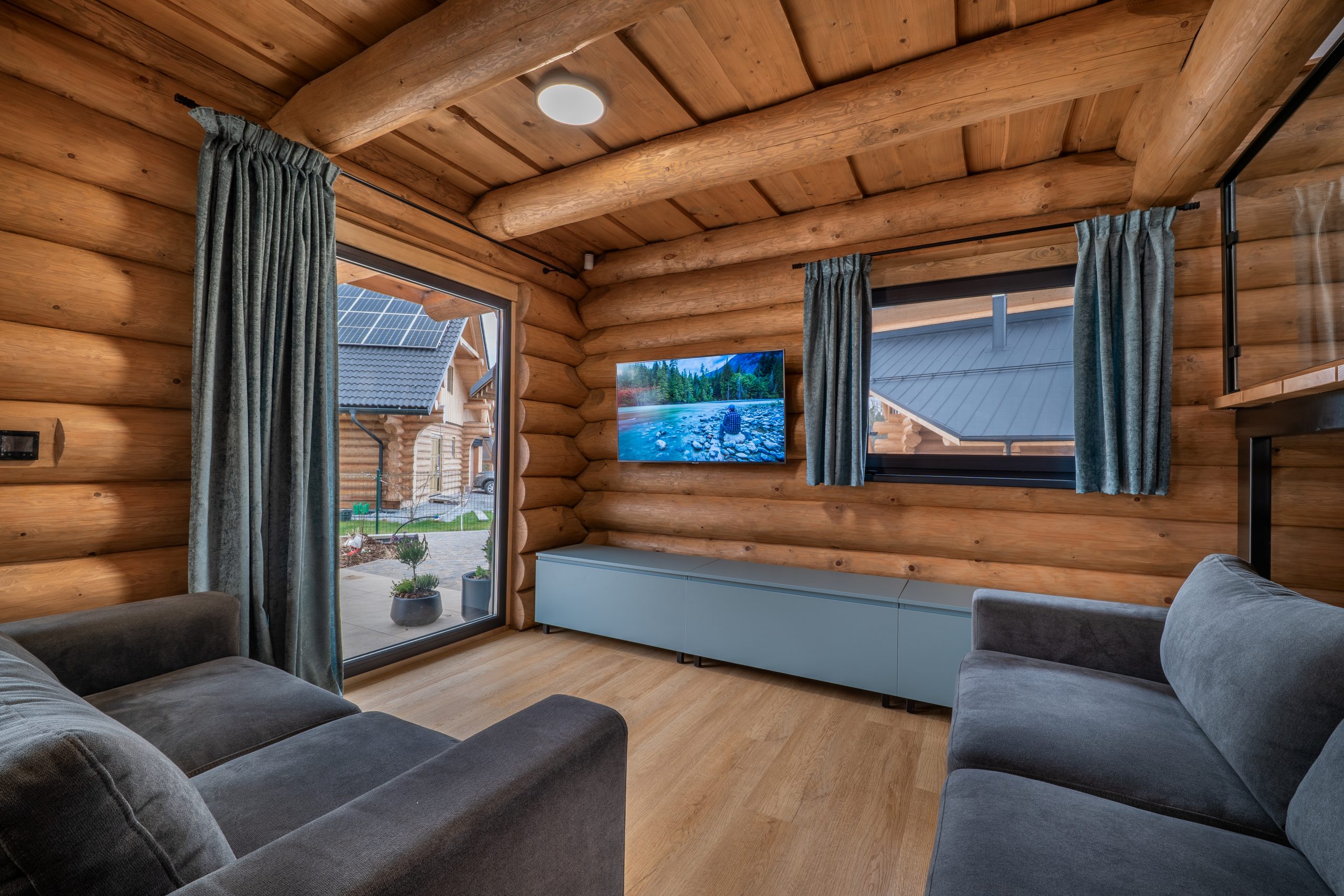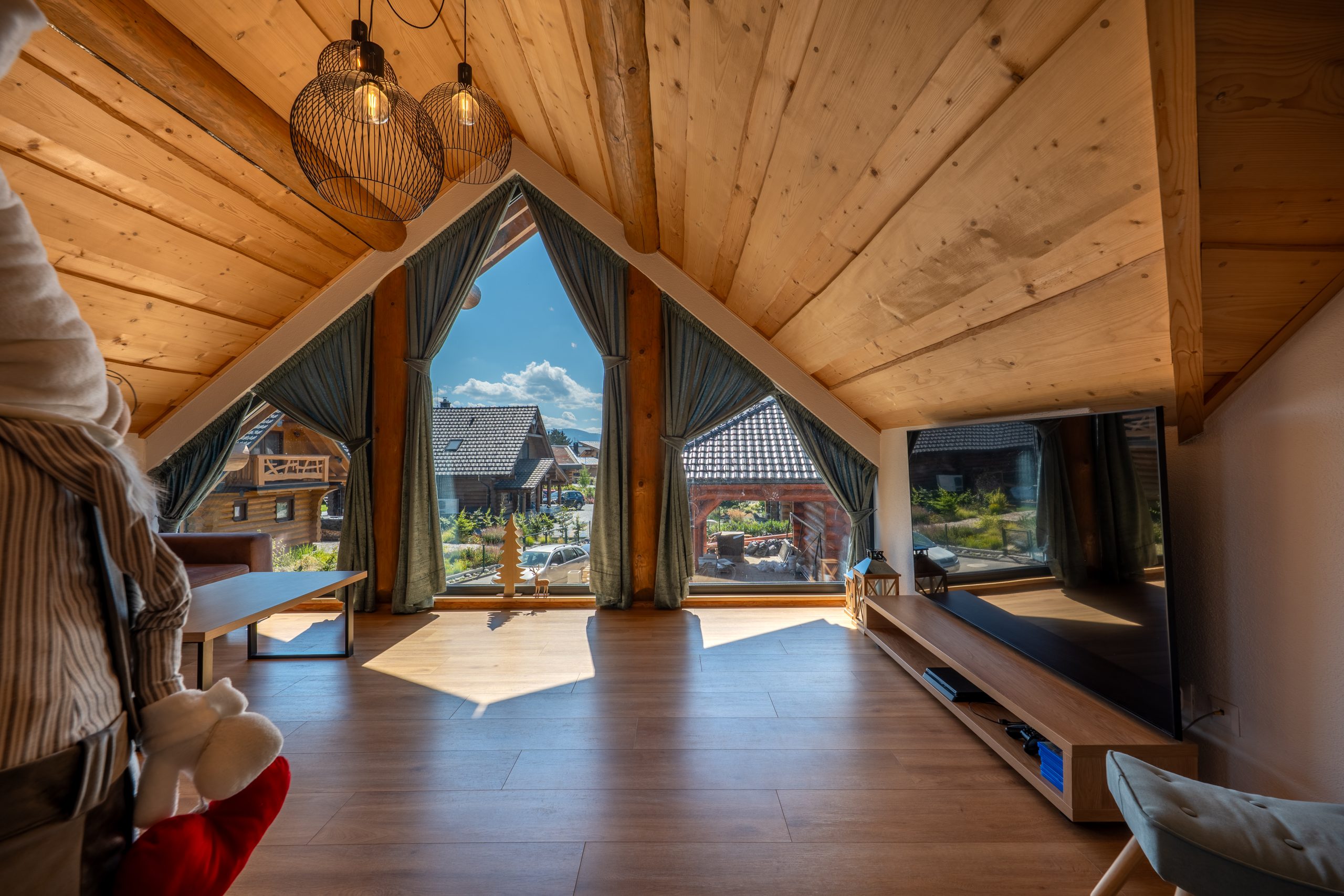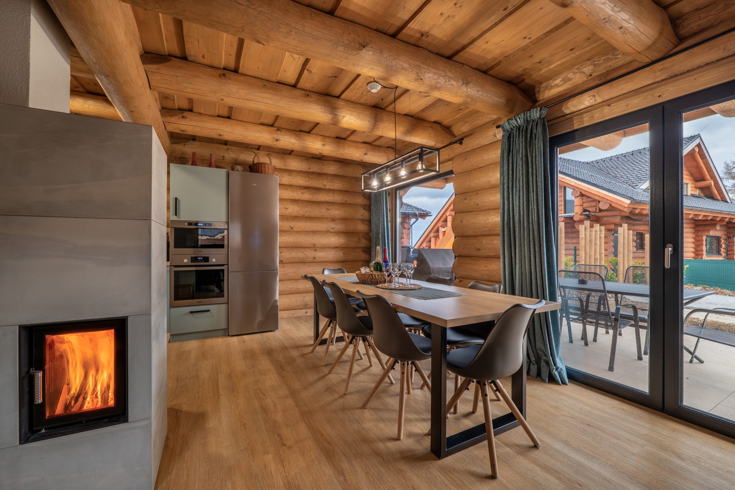 Atmosféru chaletu vytvára útulná obývacia miestnosť s krbom, gaučom, televízorom na káblový príjem a spoločenskými hrami. Je situovaná na prízemí s výstupom na terasu. Tu si môžete užiť príjemné večery s rodinou i priateľmi. S obývacou miestnosťou je prepojená plne vybavená kuchyňa s indukčnou varnou doskou, elektrickou rúrou, mikrovlnnou rúrou, umývačkou riadu, chladničkou s mrazničkou, kávovarom s neobmedzenou kávou a taktiež veľkým jedálenským stolom so stoličkami. Robotický vysávač je stále poruke. Práčka a sušička je umiestnená vedľa, v technickej miestnosti. Na poschodí využijete ďalší obývací priestor s výstupom na balkón, komfortným posedením, televízorom a Playstation. Každá miestnosť v chalete dýcha teplom prírodného dreva a elegantného dizajnu. Samozrejmosťou je bezplatné WiFi pripojenie na optický internet v celom objekte.