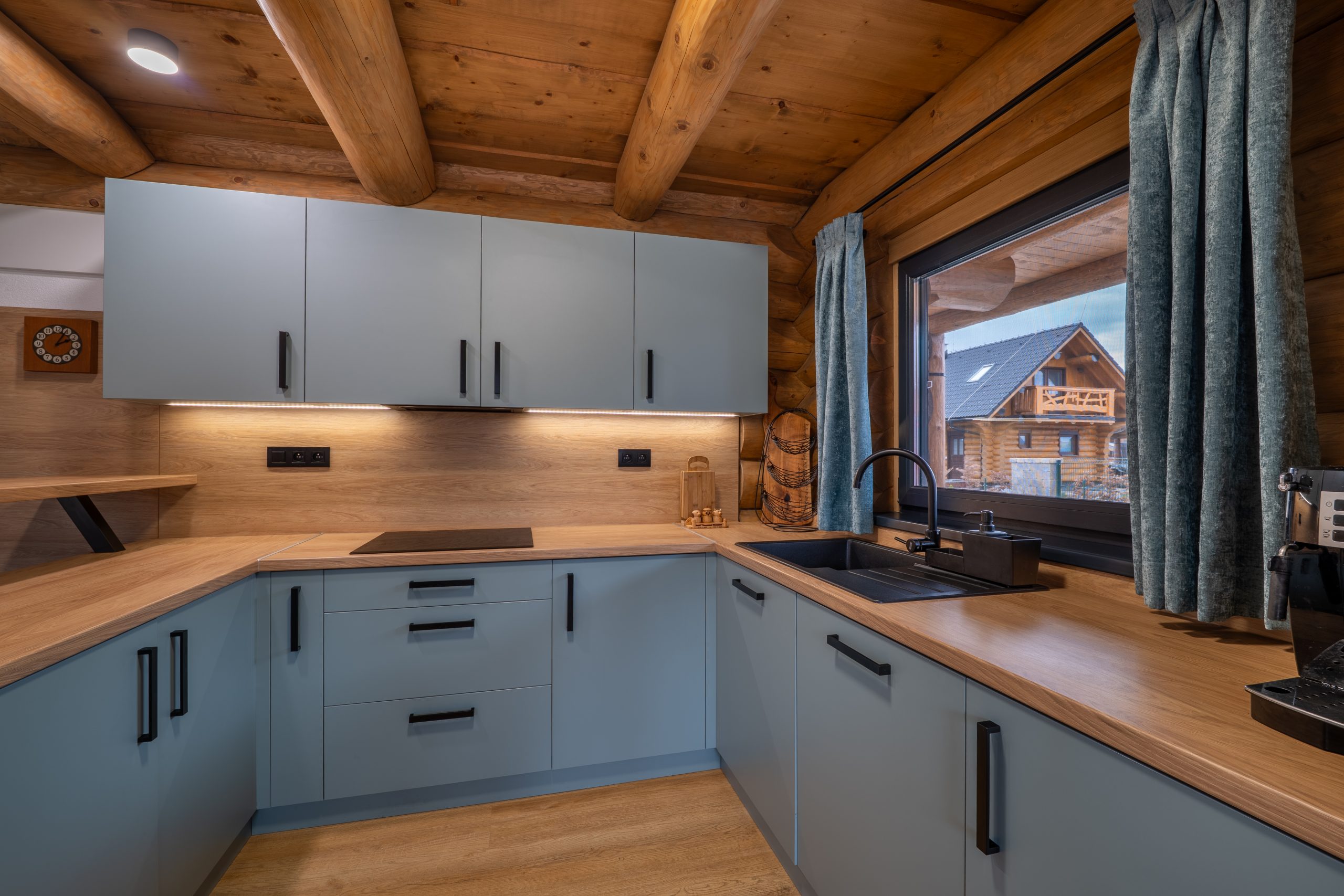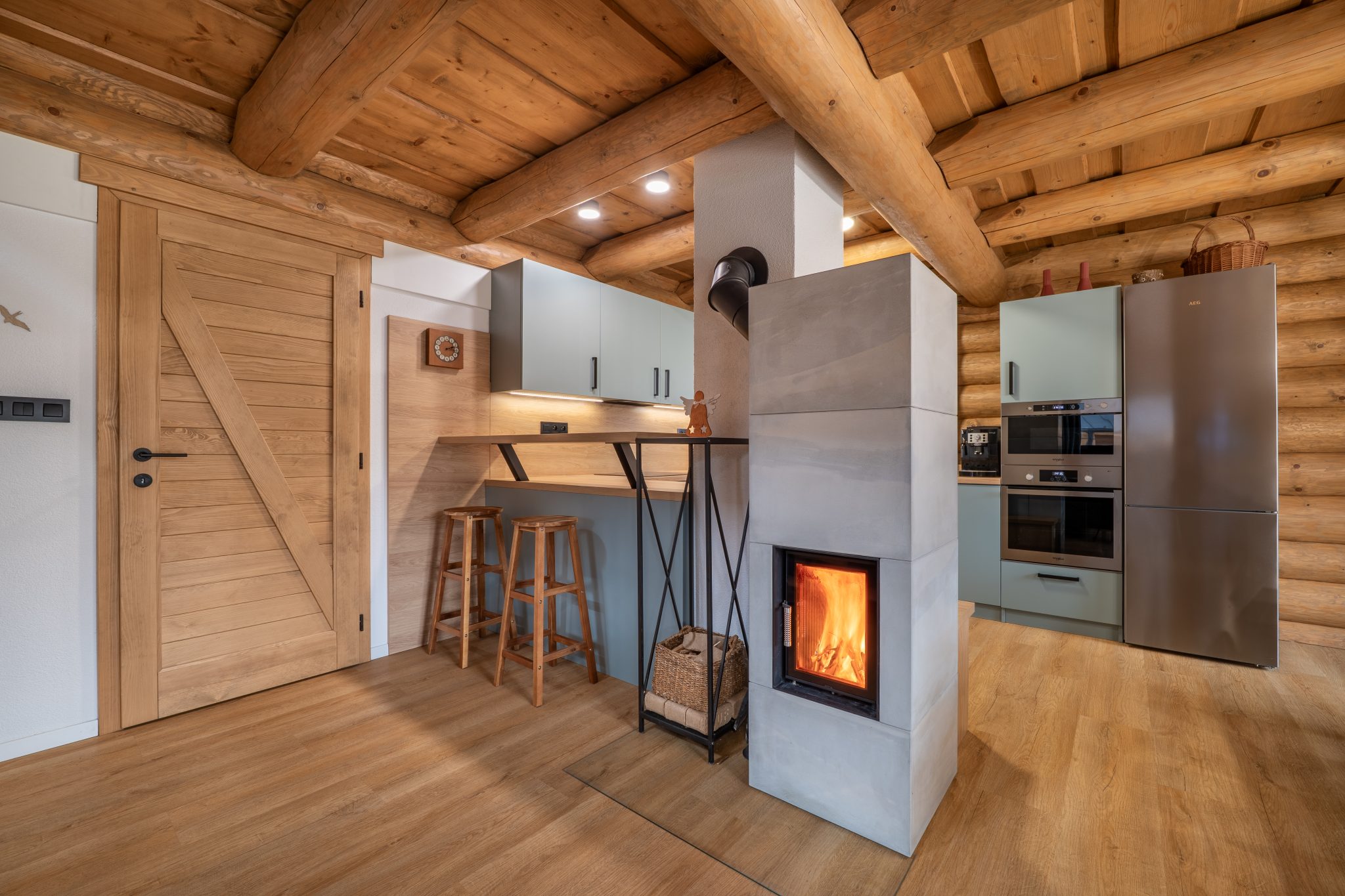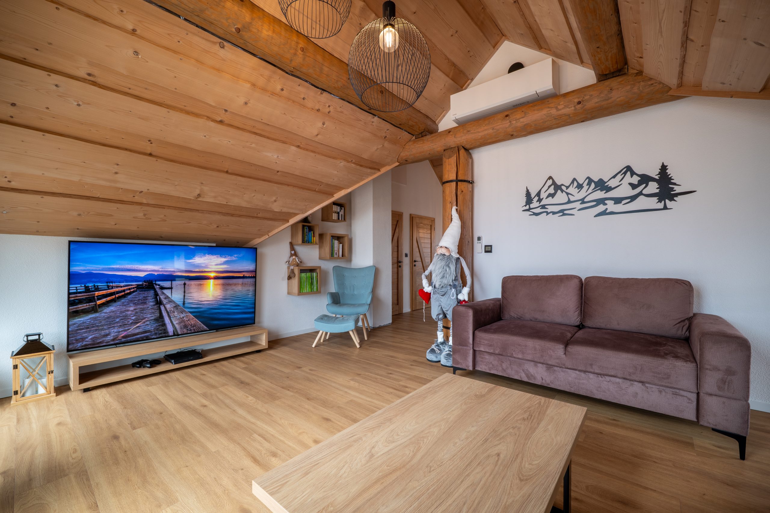 Atmosféru chaletu vytvára útulná obývacia miestnosť s krbom, gaučom, televízorom na káblový príjem a spoločenskými hrami. Je situovaná na prízemí s výstupom na terasu. Tu si môžete užiť príjemné večery s rodinou i priateľmi. S obývacou miestnosťou je prepojená plne vybavená kuchyňa s indukčnou varnou doskou, elektrickou rúrou, mikrovlnnou rúrou, umývačkou riadu, chladničkou s mrazničkou, kávovarom s neobmedzenou kávou a taktiež veľkým jedálenským stolom so stoličkami. Robotický vysávač je stále poruke. Práčka a sušička je umiestnená vedľa, v technickej miestnosti. Na poschodí využijete ďalší obývací priestor s výstupom na balkón, komfortným posedením, televízorom a Playstation. Každá miestnosť v chalete dýcha teplom prírodného dreva a elegantného dizajnu. Samozrejmosťou je bezplatné WiFi pripojenie na optický internet v celom objekte.