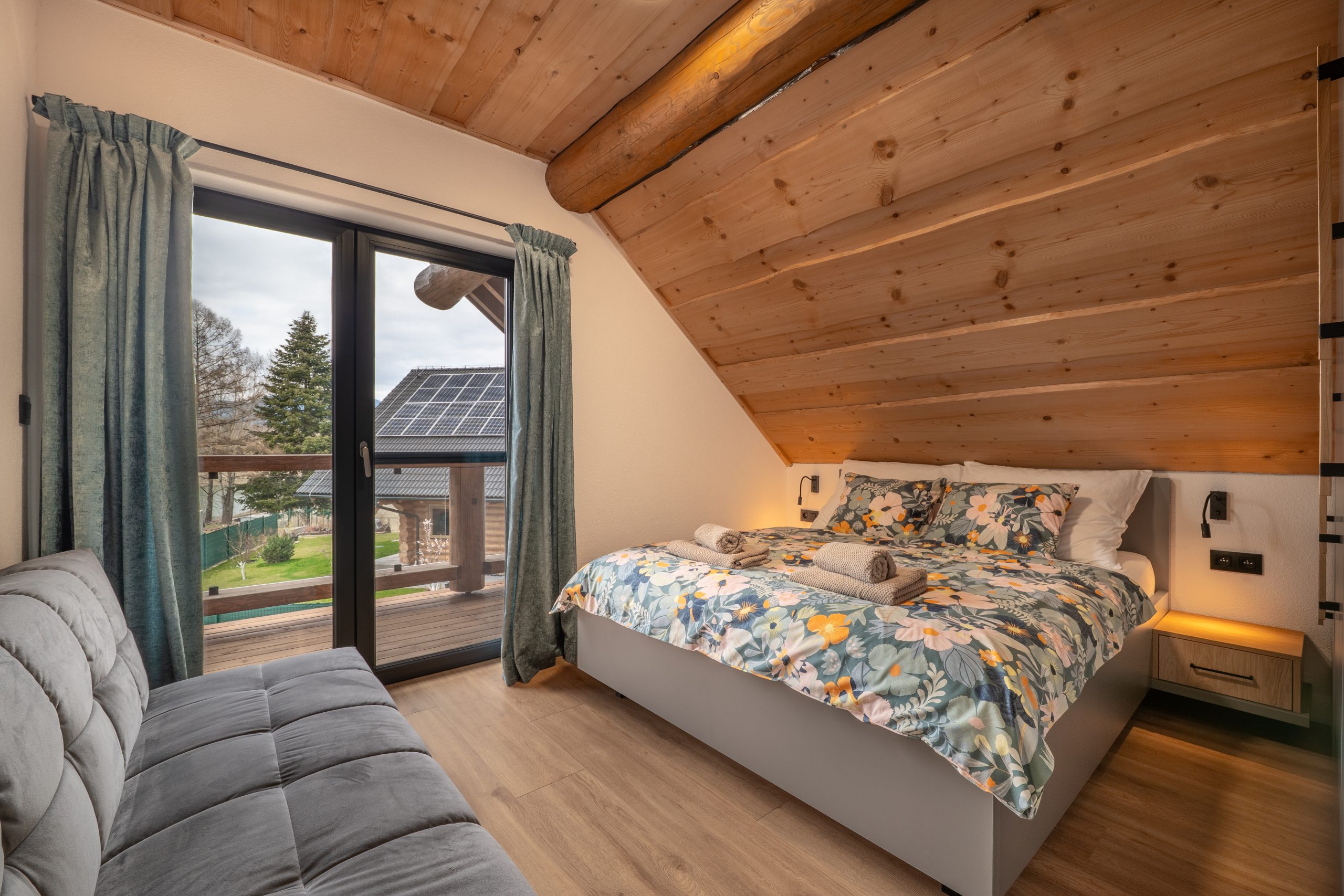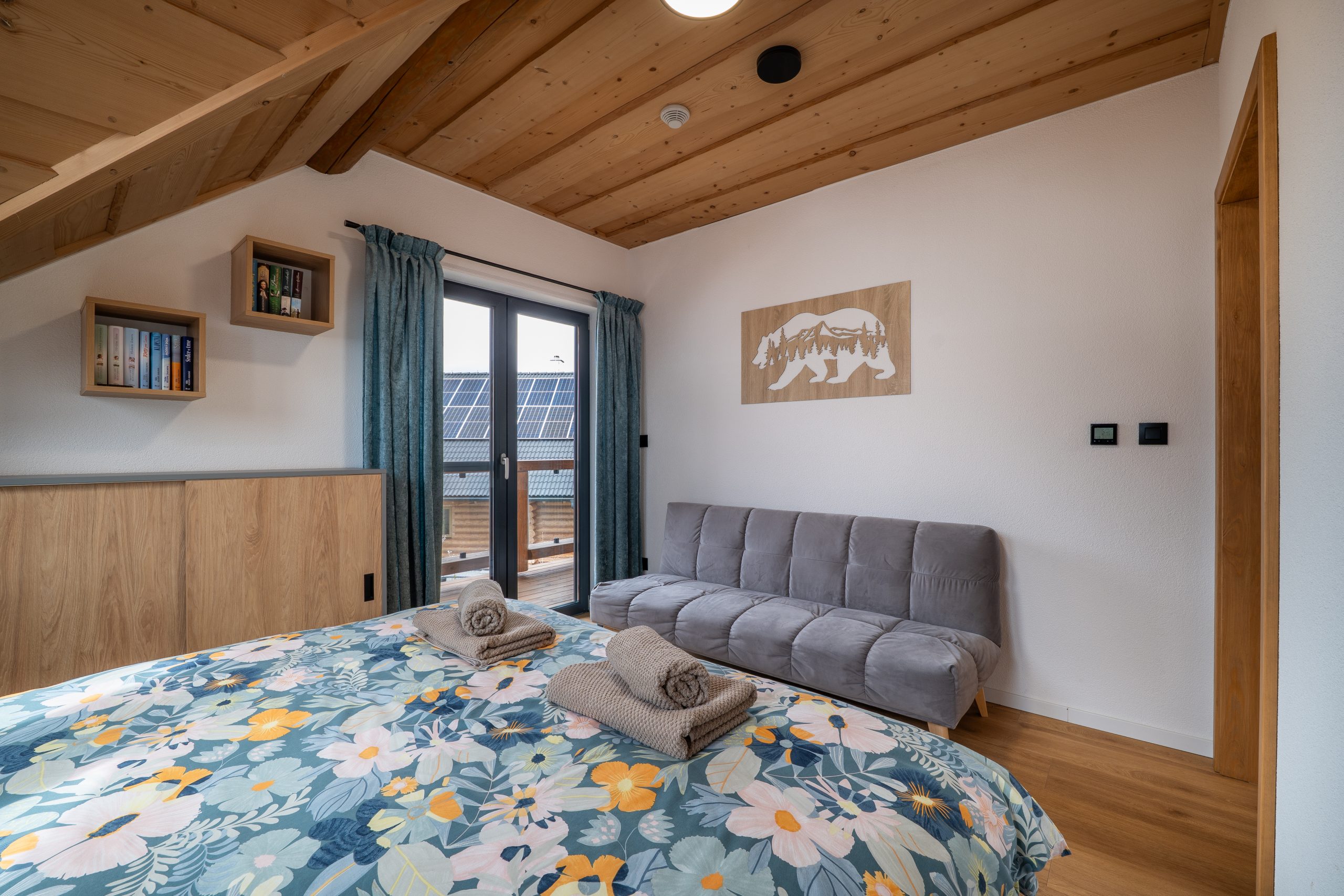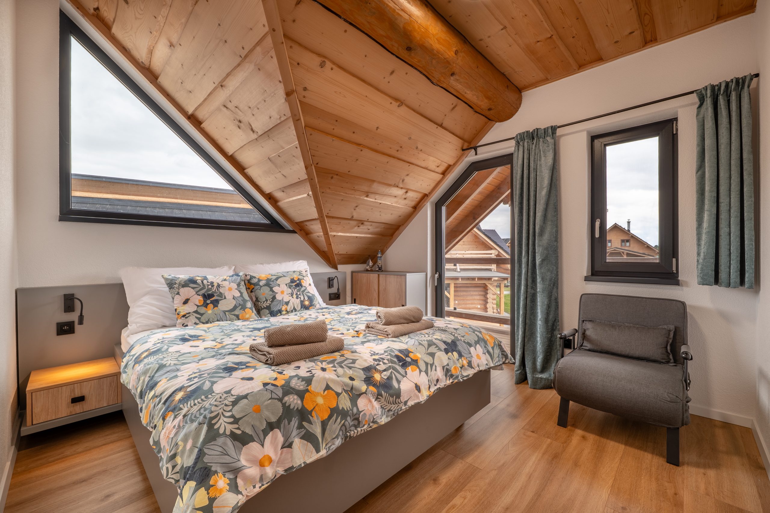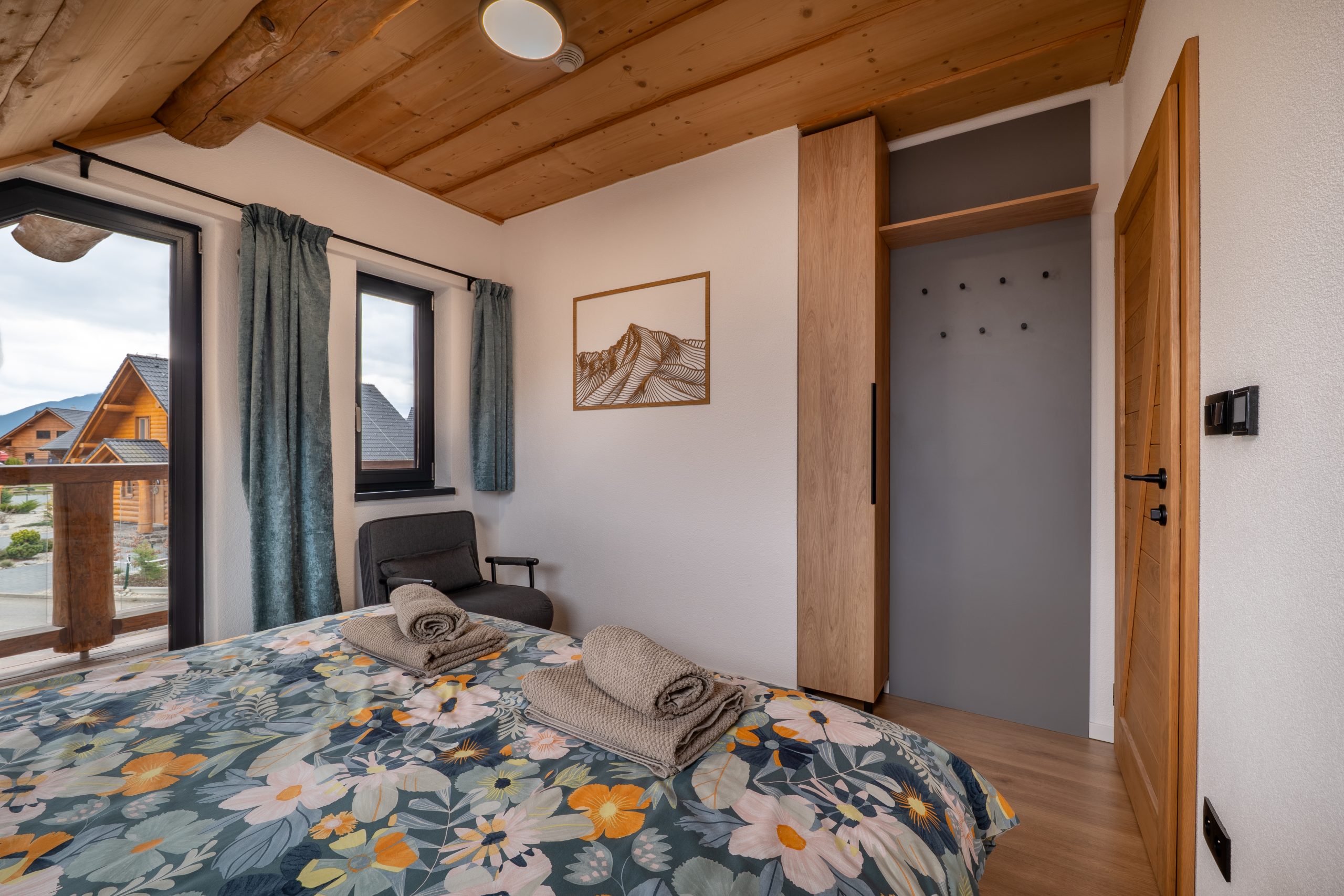 Chalet ponúka 4 štýlové spálne s kapacitou 8 lôžok a 3 prístelky. Vďaka rekuperácii a klimatizácii si udržíte príjemnú teplotu a čerstvý vzduch v interiéri bez ohľadu na ročné obdobie. Prízemie chaletu je bezbariérové. Na prízemí je pre Vás prichystaná aj 2-lôžková spálňa s manželskou posteľou a kúpeľňa so sprchovacím kútom a toaletou. Pre Váš ničím nerušený spánok Vám poslúžia 3 ďalšie spálne na druhom poschodí, z toho každá s manželskou posteľou, možnosťou jednej prístelky a vlastným výstupom na balkón.