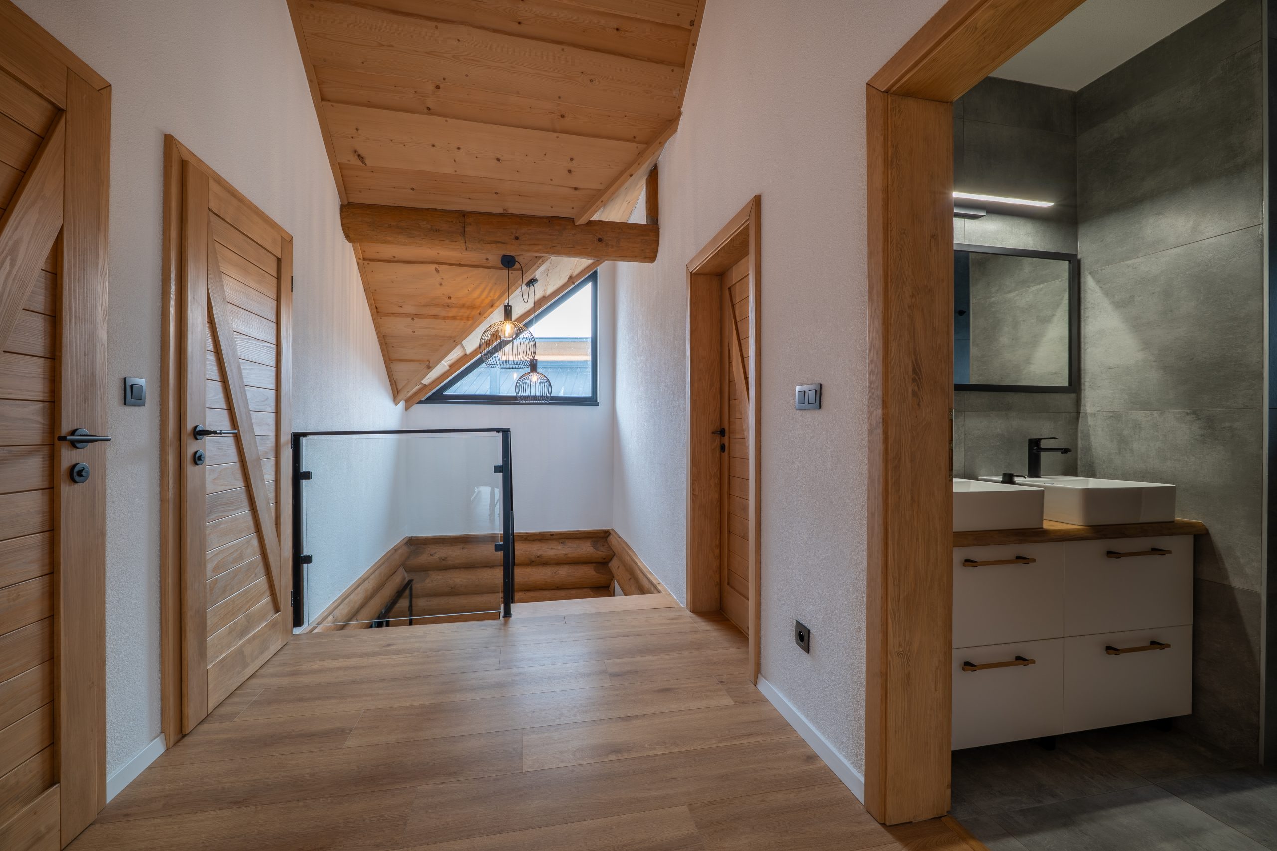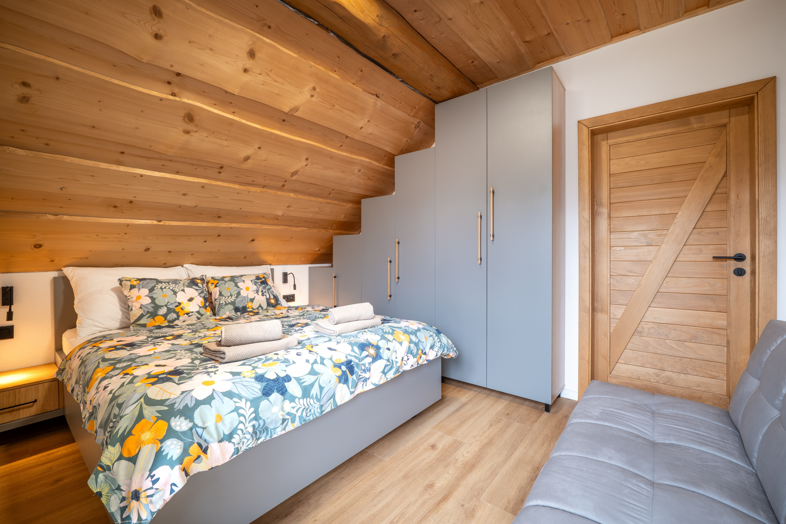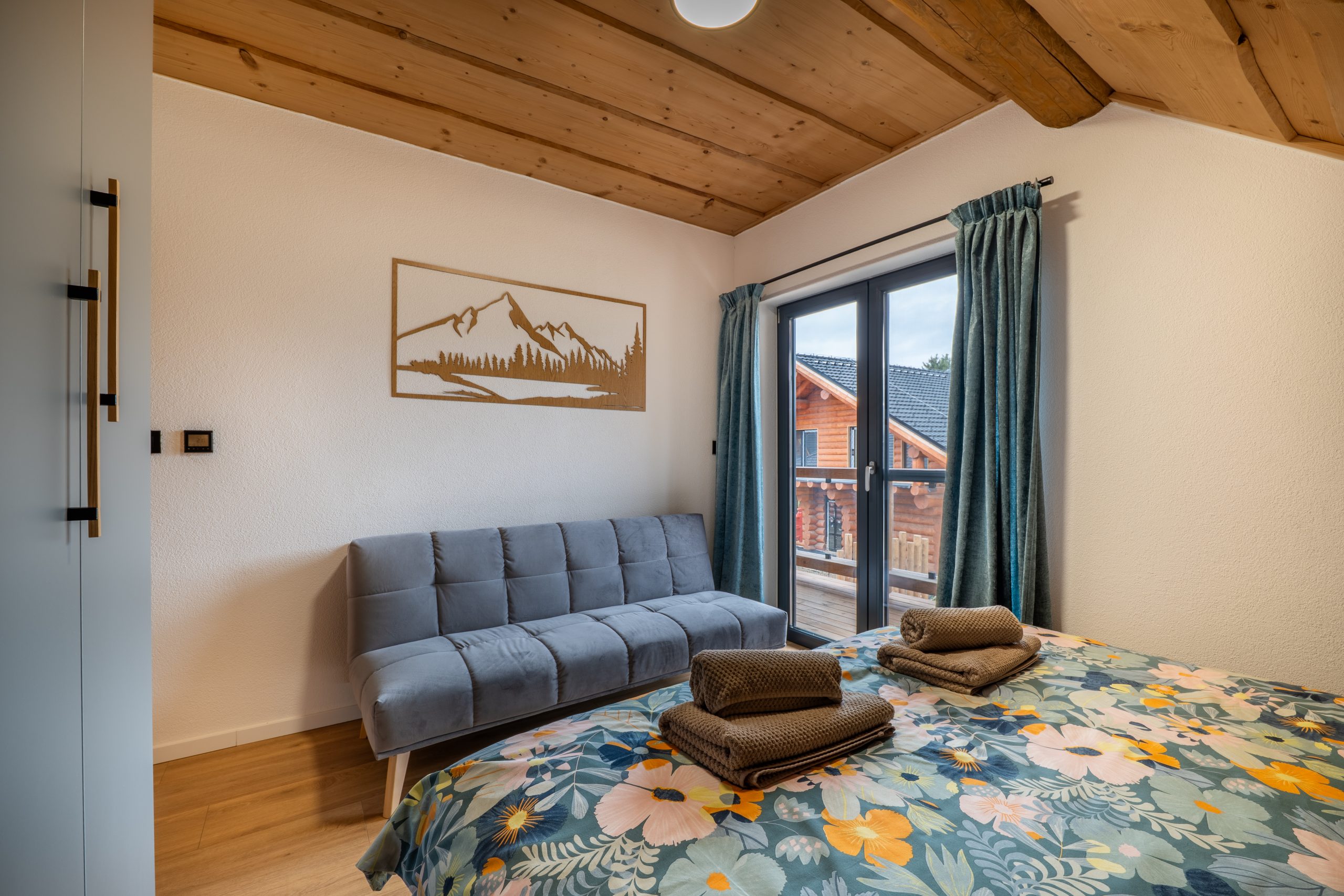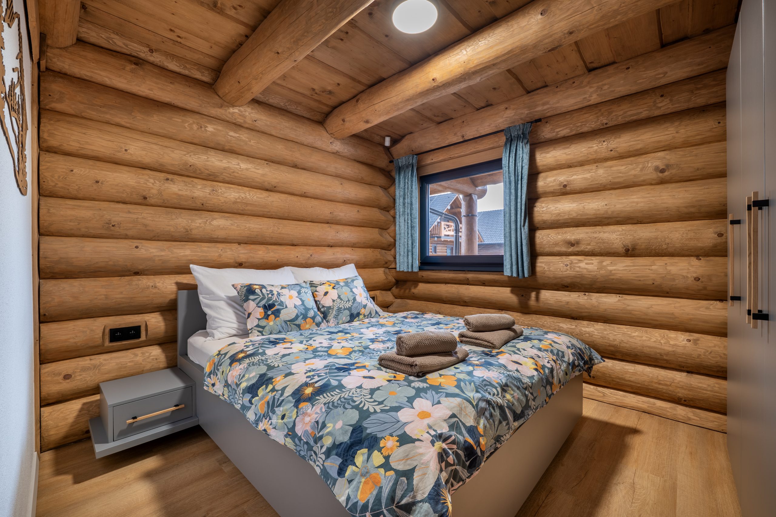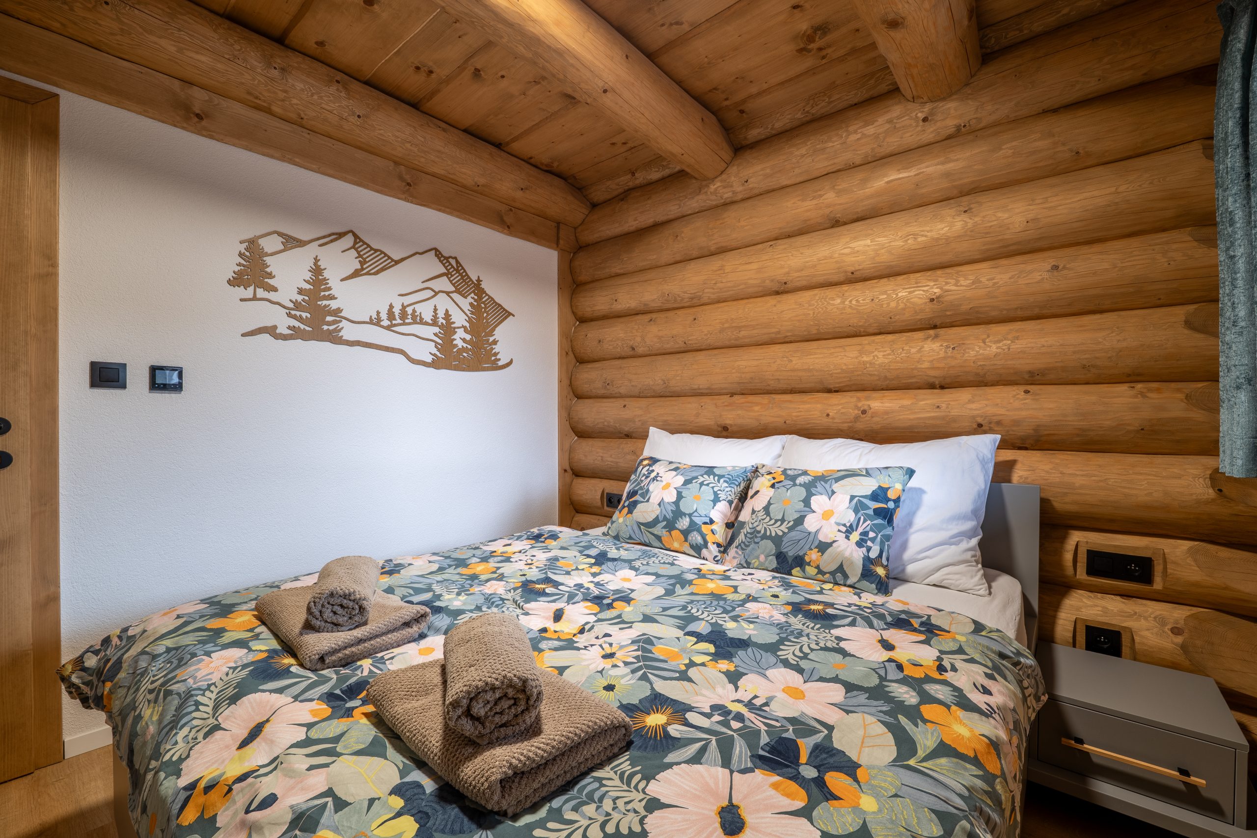 Chalet ponúka 4 štýlové spálne s kapacitou 8 lôžok a 3 prístelky. Vďaka rekuperácii a klimatizácii si udržíte príjemnú teplotu a čerstvý vzduch v interiéri bez ohľadu na ročné obdobie. Prízemie chaletu je bezbariérové. Na prízemí je pre Vás prichystaná aj 2-lôžková spálňa s manželskou posteľou a kúpeľňa so sprchovacím kútom a toaletou. Pre Váš ničím nerušený spánok Vám poslúžia 3 ďalšie spálne na druhom poschodí, z toho každá s manželskou posteľou, možnosťou jednej prístelky a vlastným výstupom na balkón.